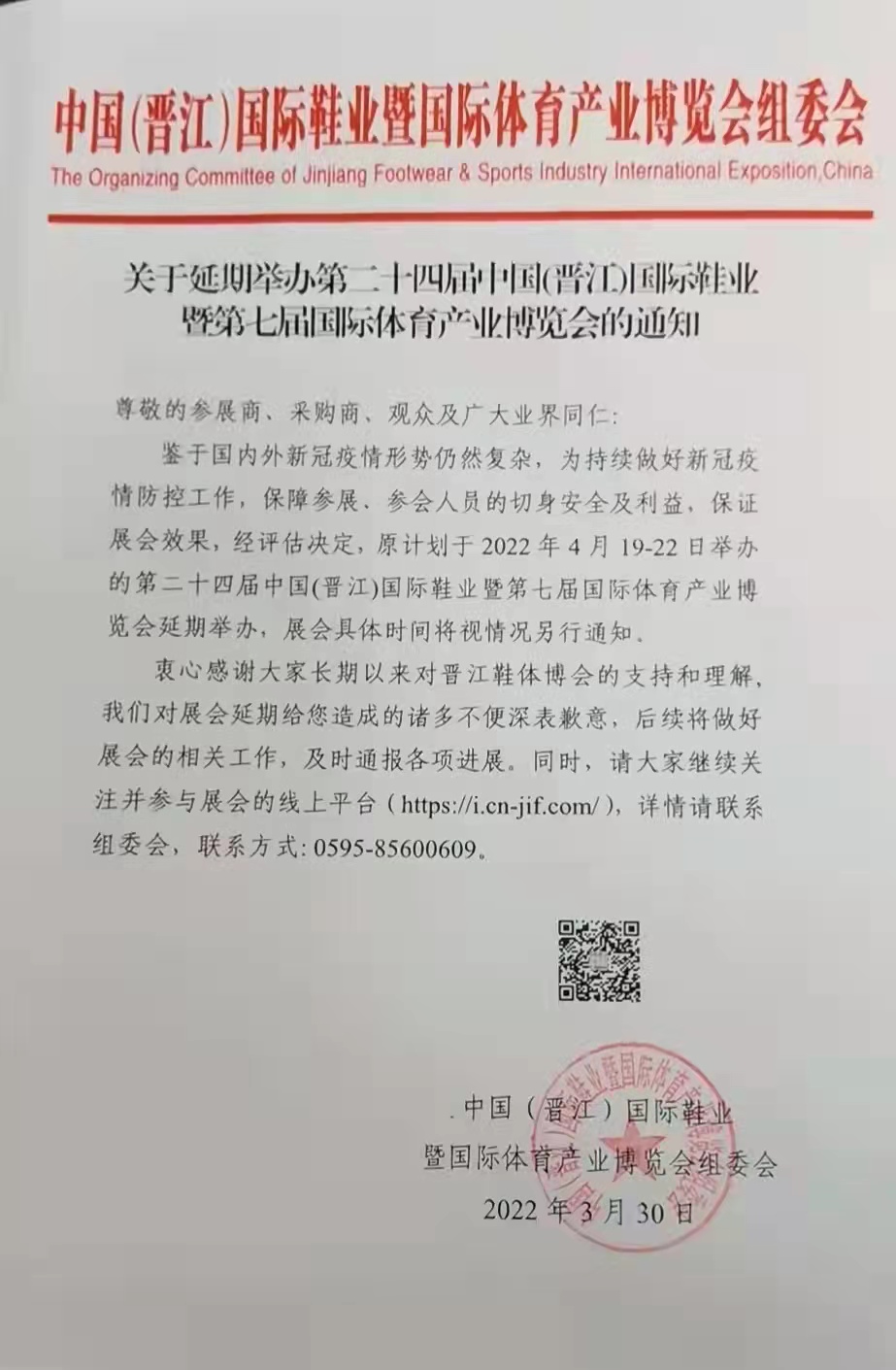 鉴于国内外新冠疫情形势仍然复杂,为持续做好新冠疫情防控工作,保障参展、参会人员的切身安全及利益,保证展会效果,经评估决定,原计划于2022年4月19-22日举办的第二十四届中国(晋江)国际鞋业暨第七届国际体育产业博览会延期举办,展会具体时间将视情况另行通知。